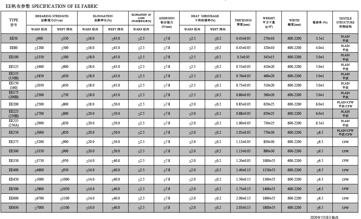 特性:高(gāo)強力,低(dī)定負荷伸長率,經向高(gāo)卷曲率,低(dī)幹熱收縮率,高(gāo)粘合強度